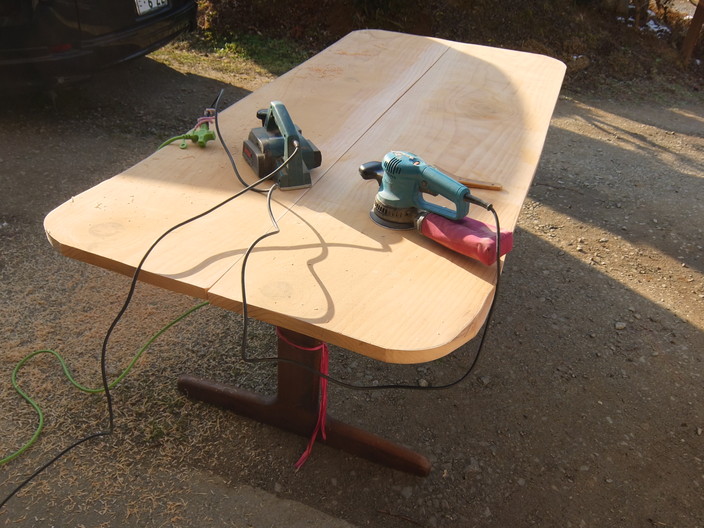 息子家族が昨年3月より同居する事になり、 一挙に8人家族と倍増。 残念ながらテーブルが小さく8人一緒に 食事ができない... そこで、DIYじぃじ テーブル&ベンチを 作ることに。 先ずは一回り大きな天板を2枚カット かんなとサンダーをかけて 今のテーブルに重ねて張りつけました。 既存の部分の塗料もサンダーで落として、 家具用塗料を塗って仕上げました。 次に2人掛けのベンチを作る事に。 補強のつもりで付けた横板が足掛けとして もGoodです。 10人は座れるようになり、 家族揃って食事ができるようになりました。